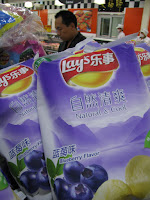 Ah ha! I spot a familiar brand at the top of the escalator: Lay's potato chips- yeah! I dodge and weave like a freshman football player (awkward and untrained) until I reach the display. What do I find? Flavors I never would have dreamed up . Blueberry or Italian red meat chips anyone?