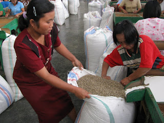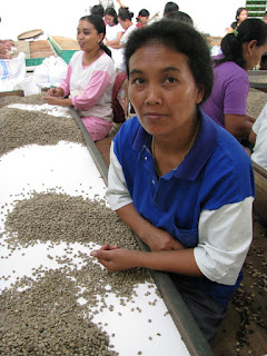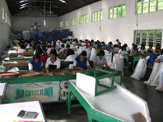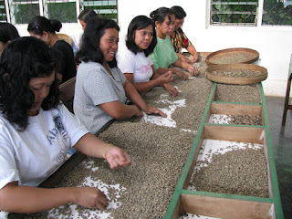 While the men are in charge of planting and harvesting, the women of the village all work in this room. They sit at long tables for 8 hours a day sorting coffee beans. The good beans go in bags, the bad ones are tossed out.