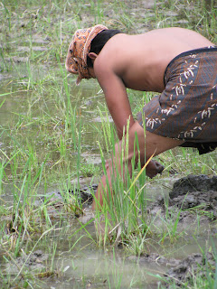 As beautiful as they look, I would not want to work in them. As you can see, this man is up to his knees in mud. Can you imagine doing this with the hot sun, bent over all day? Not me, although if I ever get the chance, I would try a day in his shoes... uh, I mean bare feet.