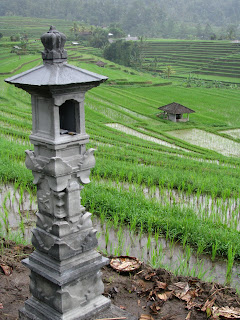 To make sure they get enough rain for irrigation and a good crop, farmers make daily offerings to the Gods. Near every paddy is a mini-temple like this one below.