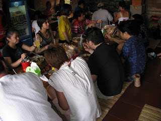 Sweaty people sit on the floor at long tables just to get a chance to try the rice which is piled high with tender slices of piggy, a piece of blood sausage, some other unidentifiable internal fried bits and pieces. It is all topped off with a piece of kulit (crispy skin).