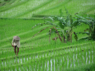 As beautiful as they look, I would not want to work in them. As you can see, this man is up to his knees in mud. Can you imagine doing this with the hot sun, bent over all day? Not me, although if I ever get the chance, I would try a day in his shoes... uh, I mean bare feet.