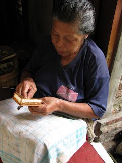 After the daily food is prepared, for example, tiny packets are presented to the resident gods of the household before the family eats. Palm leaf trays, like the one this woman is making, contain flowers, food and sometimes coins and cloth.