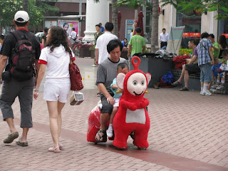 As you can see, I am starting off with a doozy, and no you aren't hallucinating- that is a woman and her child riding a motorized teletubby.